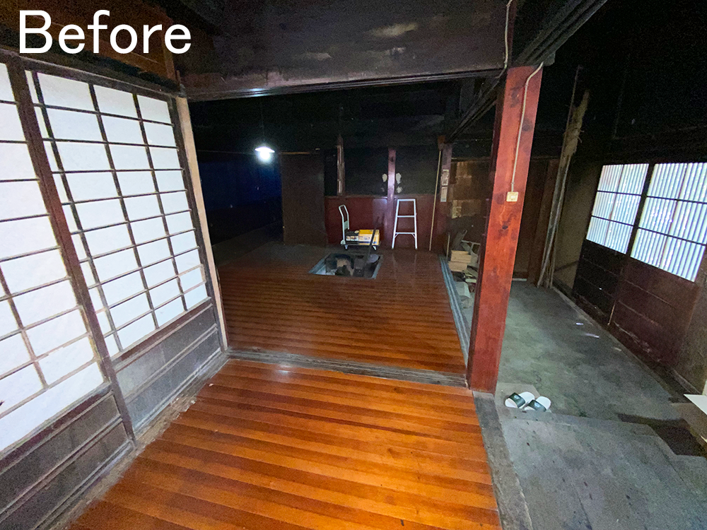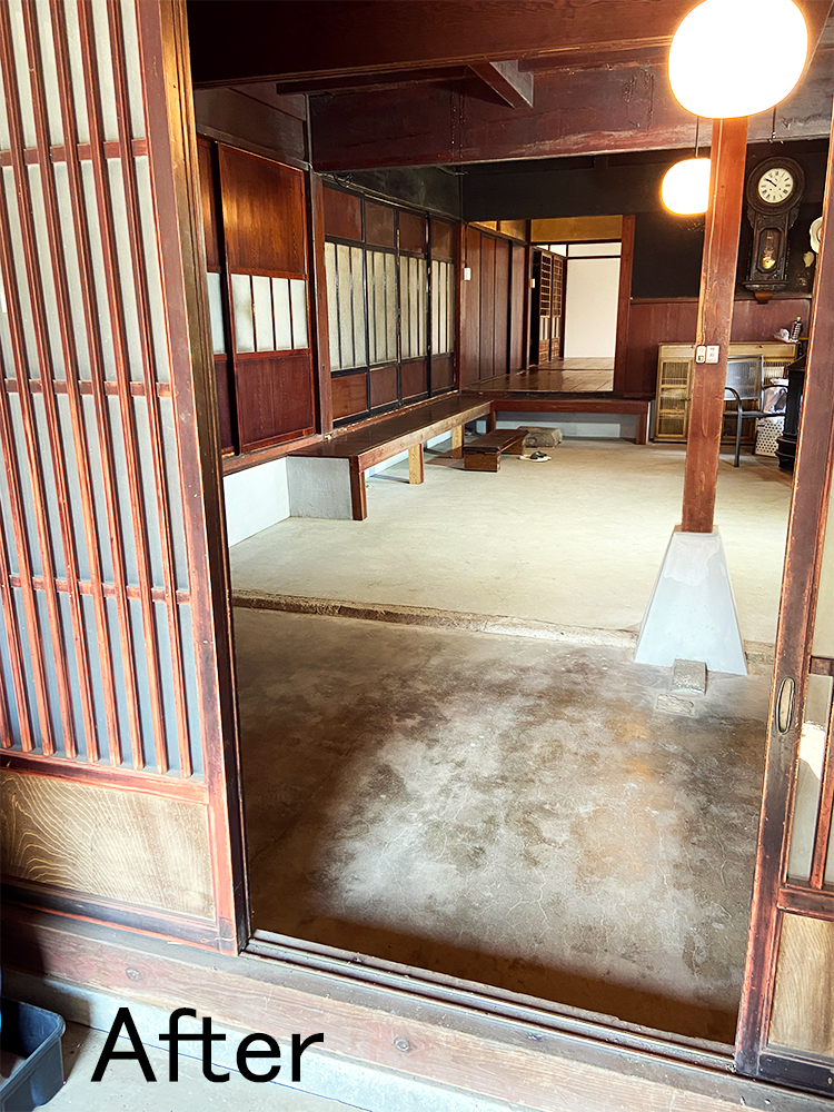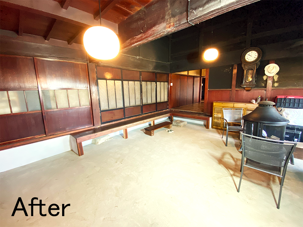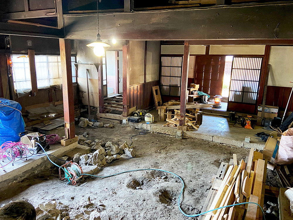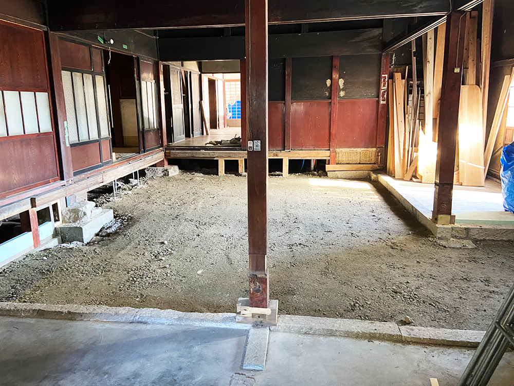床組が腐って落ちそうになっていた部屋は床を撤去し土間にしました。