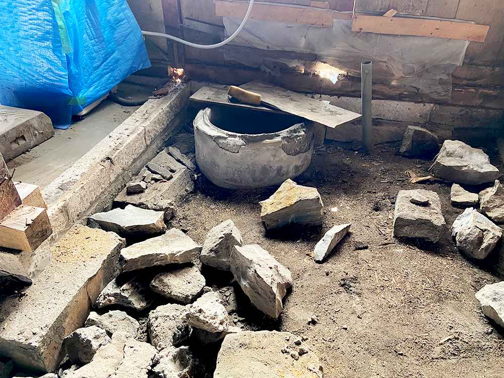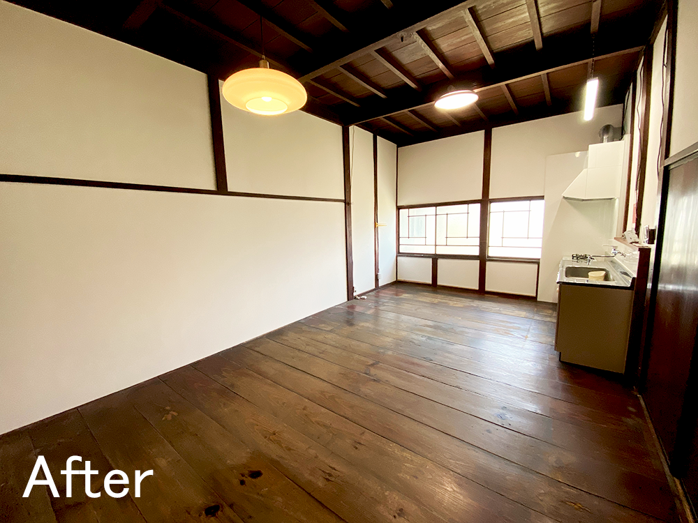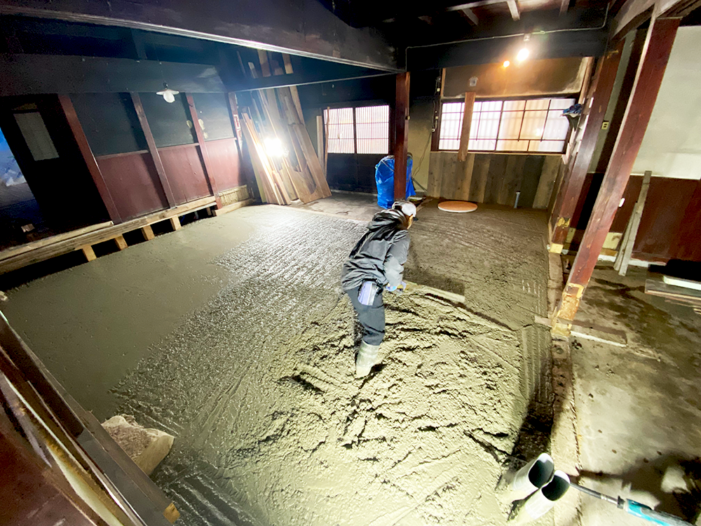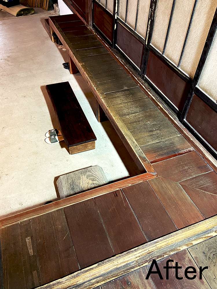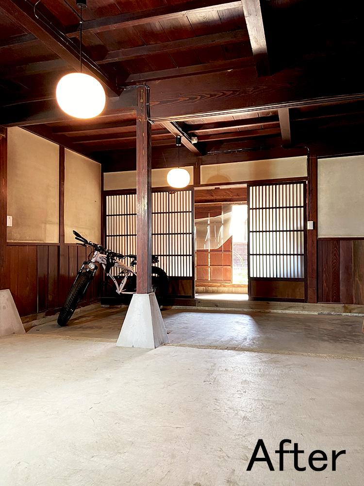 床組が腐って落ちそうになっていた部屋は床を撤去し土間にしました。