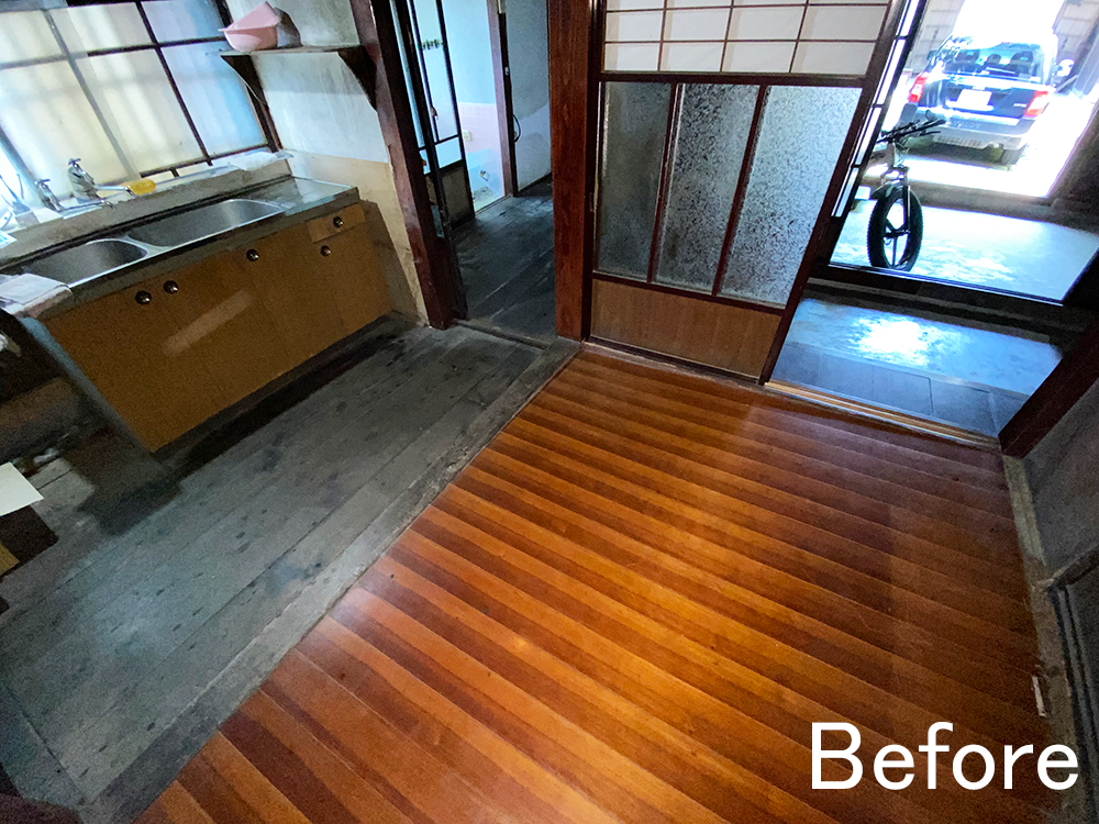 台所の様子。台所から廊下に続く板張りは、元々の材木を磨いて活用しています。