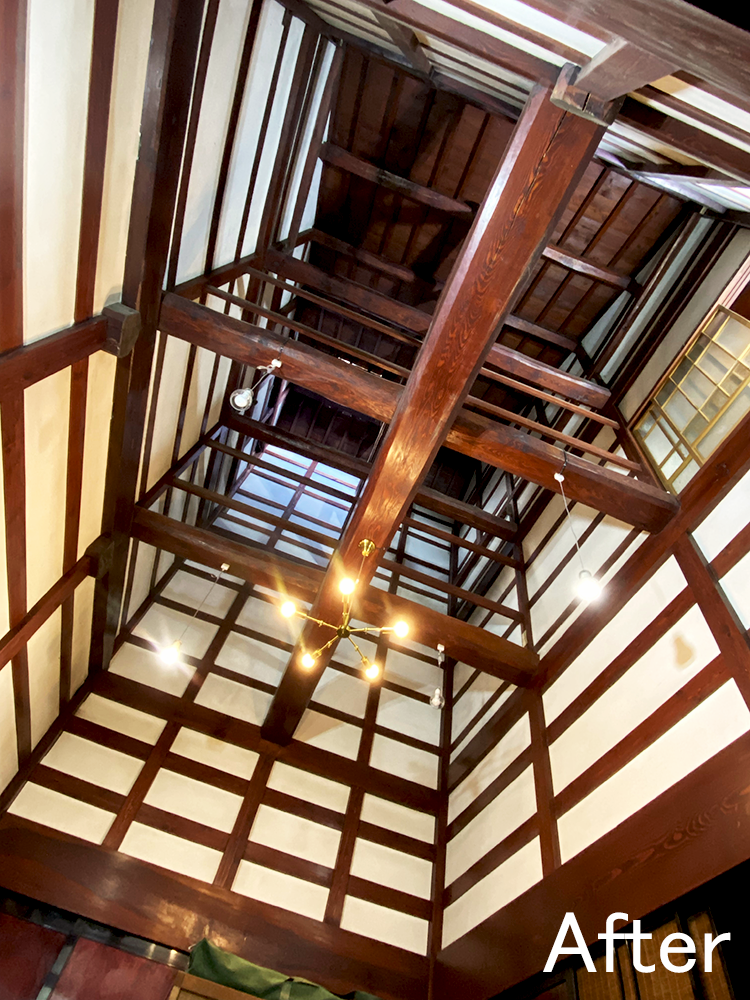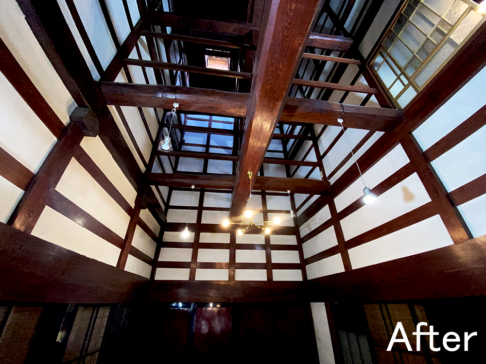 わくのうちは敢えてそのまま残し、梁を磨いてライトアップしました。