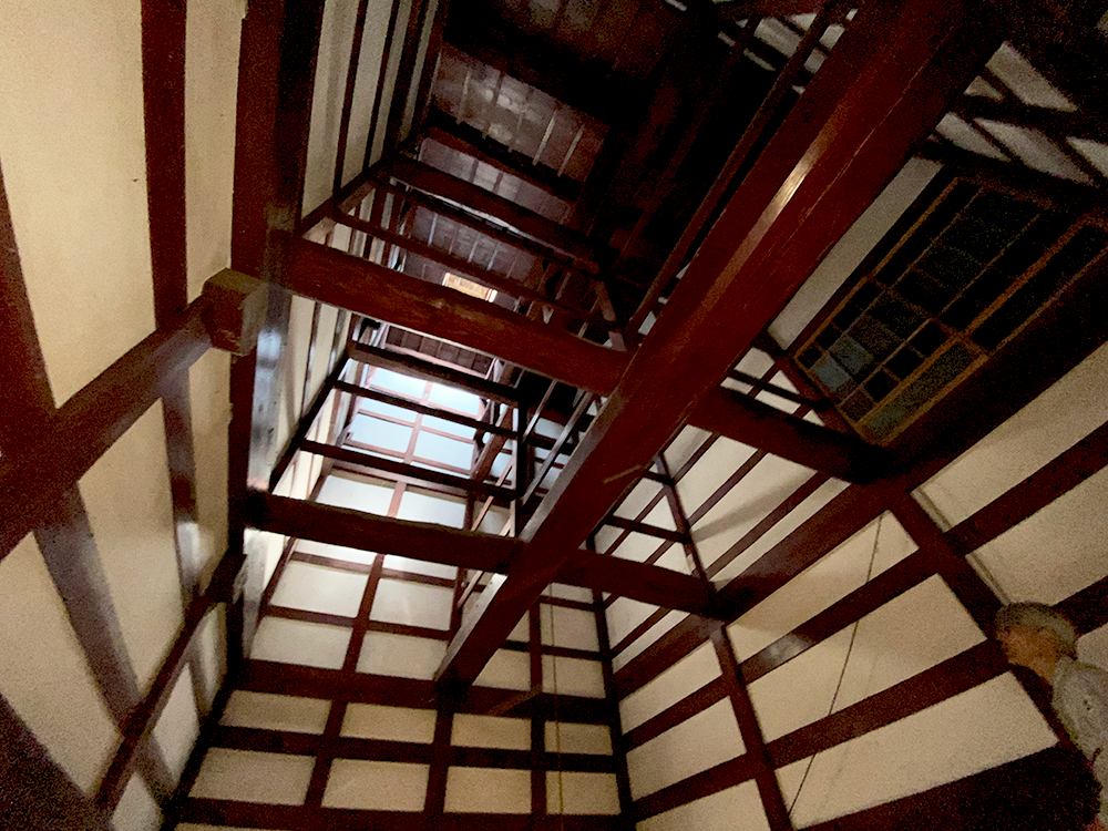 巨大な梁が何層にも積み重なった伝統工法「わくのうち工法」でつくられた吹抜けは圧巻です。