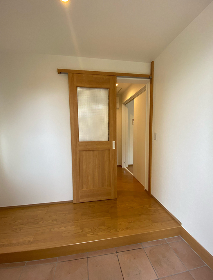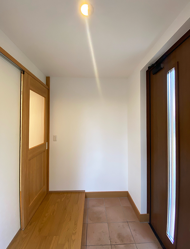 玄関に入ると、アンティークなチェックガラスを使った引き戸が安心感を与えてくれます。